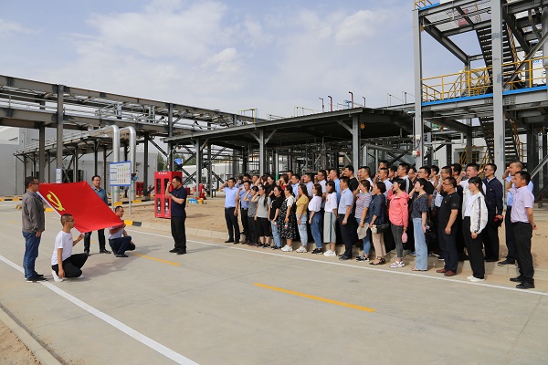 活動(dòng)伊始,全體黨員俯瞰了化工園區(qū)整體建設(shè)情況,工作人員對(duì)石投集團(tuán)全力打造的基礎(chǔ)配套設(shè)施管理運(yùn)營(yíng)、專精特新廠房集聚帶動(dòng)、科技工程示范引領(lǐng)三大特色產(chǎn)業(yè)板塊進(jìn)行了全面介紹。全體黨員走進(jìn)石投集團(tuán)專精特新產(chǎn)業(yè)園A區(qū)標(biāo)準(zhǔn)化專用廠房,看到了眾多入駐企業(yè)安裝設(shè)備、試車投產(chǎn)的火熱景象。在液態(tài)陽(yáng)光示范項(xiàng)目現(xiàn)場(chǎng),近距離參觀了解全球首套千噸級(jí)規(guī)模太陽(yáng)燃料合成示范項(xiàng)目,并在項(xiàng)目現(xiàn)場(chǎng),全體黨員面對(duì)鮮紅的黨旗,莊嚴(yán)地高舉右拳,鏗鏘有力地重溫入黨誓詞,將共產(chǎn)黨員的榮耀、責(zé)任和使命牢牢銘記在心中。